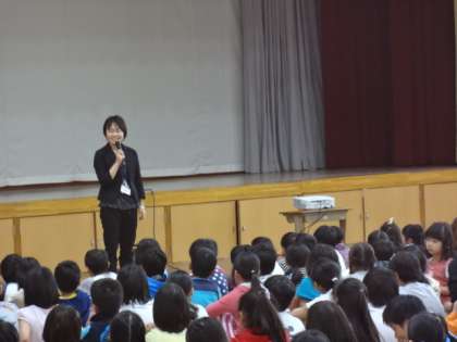 後半は,校長先生のお話を聞きました。日本のきまり「日本国憲法」。その中の「基本的人権の尊重」についてのお話でした。みんなかけがえのない命をもって生まれてきました。一人一人が大切な存在です。学級で,社会で,本当に一人一人が大切にされているのだろうか・・・・・。最後には,「手のひらを太陽に」の歌を歌いました。人間も動物も,植物もみんな友達で,大切な命をもっているという歌です、