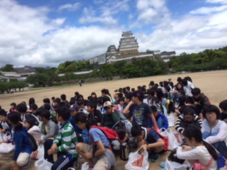 姫路城の近くでお弁当を食べました。食べ終わったら,天守閣に上ります。