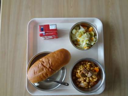 その後,給食室や1年生の給食参観をし,給食をいただきました。本日のメニューは,ミルクコッペパン・牛乳・ポークビーンズ・野菜のホットマリネです。