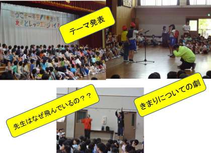 1年生が6年生に連れられて体育館に入場です。全校で「あの青い空のように」を合唱した後,集会委員会が企画したゲームや児童会のきまりについての寸劇が行われました。それに対して1年生は,とても元気よく歌で返してくれました。