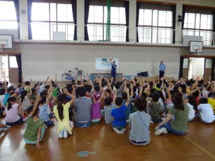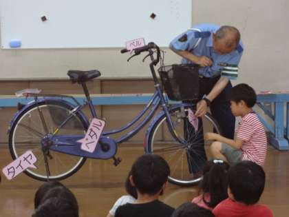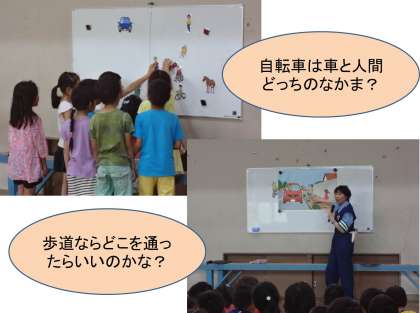 下鴨署の警察官の方から,まず,自転車は車の仲間かな?人の仲間かな?と質問されました。馬やベビーカー,車いす,三輪車などはどうかな?