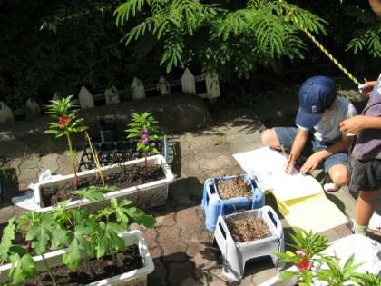 3年生や4年生は,水やりをした後に植物の観察をして,カードに成長の様子を記録します。4年生は,大きく育った「ツルレイシ」は,観察の後に収穫してよいことになっており,うれしそうに手に持って帰る子どももいます。