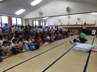 寝具の準備や片付けの仕方を,90畳の大広間で教えてもらいました。