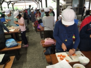 いよいよ野外炊事。みんなで協力してカレーを作ります。慣れない手つきで材料を切り,火をおこし・・・。でもなかなか火がつかないようです。いつになったら食事にありつけるのでしょうか・・・。