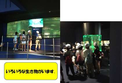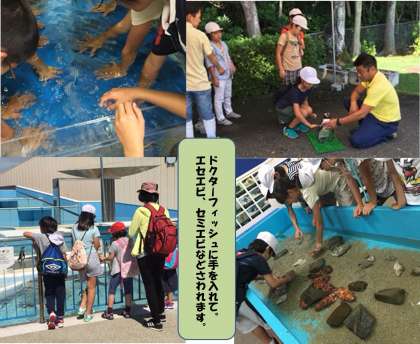 館内見学では,いろいろな生き物に大興奮の子どもたちでした。ドクターフィッシュに手を入れたり,エセエビ、セミエビなどを触ったりしています。