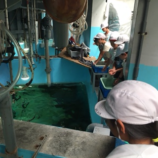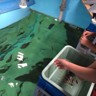 えさやり体験。基本,冷凍のアジやオキアミをえさにしているそうです。