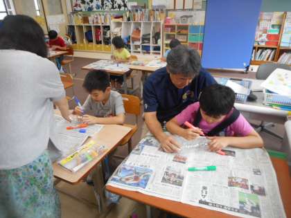 ペットボトルに思いおもいの絵を描き,噴水が完成すると,早速外に出て遊びました。笛を吹く要領で一方のストローに息を吹き込むと・・・見事,もう一方のストローから水が吹き出ました。子どもたちは大喜びで,何度も遊んでいました。