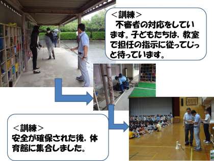 9月20日(火)の2時間目に避難訓練(不審者対応)を実施しました。警察の方の指導の下,対応の仕方を教職員が学びました。児童は,担任の指導により教室内で集まり次の指示があるまで,じっと待っています。
