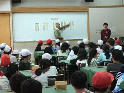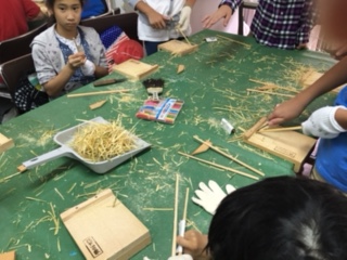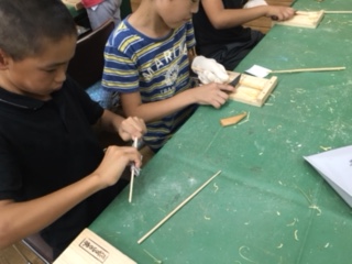 昼食後は,いよいよごはん用の竹ばし作りです。結構太い竹をおはしのように削るのに,みんな苦労していました。小刀をにぎりしめ,慣れない手つきでがんばっています。世界に一つだけのすばらしい竹ばしができあがりました!