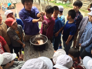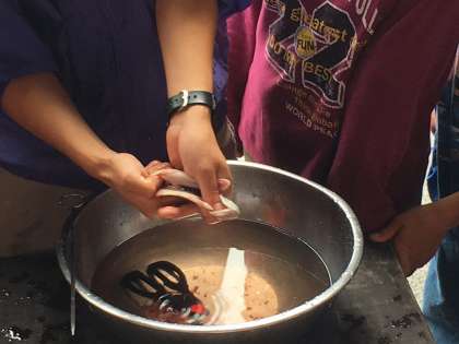 天候があまりよくないため,たらいに入っている魚をつかむことになりました。まずはしっかりと説明を聞くことから・・・。