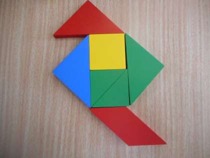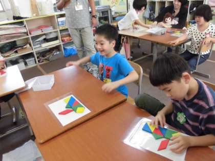 9ピースの色板を使って,様々な図形を作る学習をしています。直角三角形,正方形,平行四辺形など,それぞれの色板の特徴をつかんで,同じ大きさ,同じ向きになるように図形のシルエットに置いていきます。
