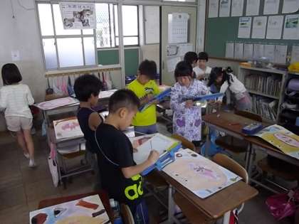 図工の時間に取り組んでいた「お話の絵」が完成し,みんなで友だちの作品を鑑賞しました。見る視点として,描いた線や色の表し方の工夫など良いところを見つけて話し合ったり,「自分なら〜する」といったアドバイスをし合い,プリントに書きこんだりしていきました。