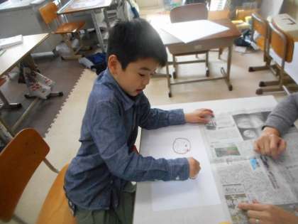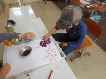 6組では図画工作の学習で,「秋のくだもの」をテーマに絵を描き始めました。自分の好きな秋の果物(みかん,ぶどう,柿,梨など)を選び,よく観察しながら線描したり,色を塗ったりしていきました。改めて果物をよく見てみると,へたの形が星型になっていたり,様々な色が混ざっていたりすることに気付き,絵に表現することができました。