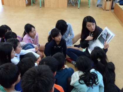 また,今回の土曜学習では本校の卒業生が,子どもたちにアメリカ留学の体験談を話してくれました。子どもたちは写真を見せてもらいながら熱心に話を聞いていました。
