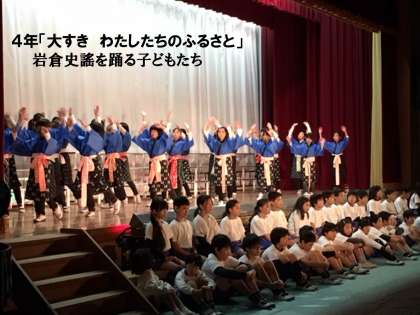 地域の皆様,保護者の皆様,お忙しい中にも関わらず,学芸会にお越しいただき,ありがとうございました。そして,保護者の皆様には,今日までの子供たちへの励ましの声掛けや,衣装などの準備などでご協力いただきました。重ねてお礼申し上げます。さらに,4年生の「大好き わたしたちのふるさと」の中の岩倉史謡の演技では,岩倉南学区社会福祉協議会・岩倉南女性会の皆様に踊りの指導や前掛けを貸していただき,ありがとうございました。このようにして伝統が引き継がれていくのだなと感じています。今後とも,ご支援・ご協力よろしくお願いいたいます。     校長 石田和三
