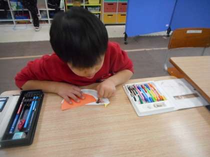 お祝いする気持ちを表す自分の顔を描いたり,桜の木や花にきれいな色を塗ったり,紙皿を使って小鳥を作ったりしました。顔の描き方を覚えていてどんどん自分から進める子,絵の具で目いっぱい桜の色をつけていく子,小鳥の羽の位置や目の大きさにこだわって作る子など,様子は様々でしたが,卒業や入学を祝うにふさわしい,心のこもった作品になりました。