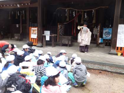 社会科の「地域の人々が受け継いできたもの」の学習で,幡枝八幡宮で宮司さんの話を聞きました。話を聞く前,自分たちの校区で行われている幡枝八幡宮の秋祭りが1100年間続いていることを知ってとても驚いていました。
