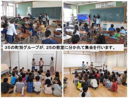 本校は,集団登下校を行っておりませんが,いざというときには,集団で下校できるように町別グループを作っています。今日は,一回目の集会でした。1年生メンバーの歓迎と紹介,通学路の安全確認を行いました。