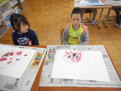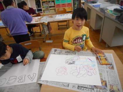 図画工作の時間に絵を描くとき,「自由に描く」ということは意外と少ないものです。テーマが決まっていたり,教わった表現方法を使って絵を描いたりすることが多いからです。もらった1枚の画用紙を目の前に,迷うことなく絵を描き進める子,「どんな絵にしようかな。」と構想を練ってから描き始める子,様々な色を使いたい子,細かい形にこだわって描く子,これまでの学習経験を活かして描く子,と子どもたちの思いが様々な形で表現されていました。今後の学習においても,こうした子どもたちの思いを大切にして進めたいと思います。