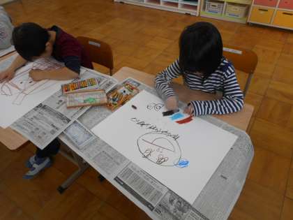 パスを使って,子どもたちが自分の描きたい絵を考え,画用紙いっぱいに描きました。