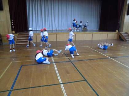 白ぼうしの人は旅人役。赤ぼうしの人は忍者役。上手にまねをしてついて行きます。