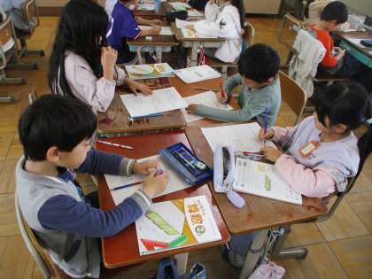 同じ数のまとまりに着目して、L字型に並んだものの数を、かけ算を使って考えたり、説明したりする活動に取り組みました。
