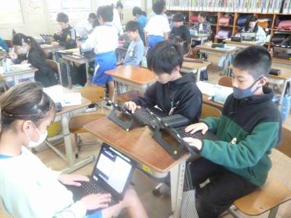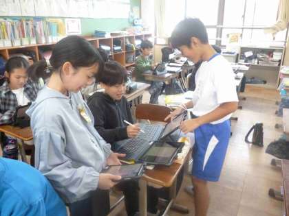 社会科で、日本の工業生産について学習しています。今日は伝統工芸品についてグループで相談しながら、どのように調べていくか考えていました。