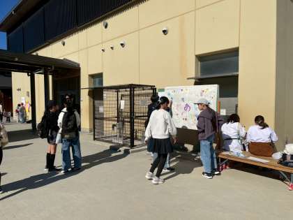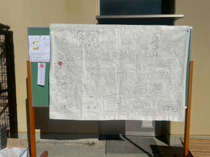 ふれあい祭で、6年生がブースを企画しました。写真のチームは、みんなで1枚の塗り絵を完成させる企画です。たくさんの方に少しづつ協力をしていただいたおかげで、素敵な一枚絵が完成しました。