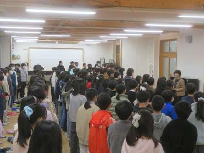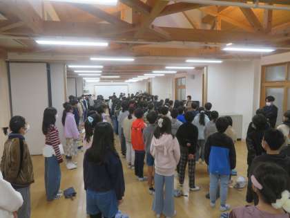 校内鑑賞会直前に、みんなで声出しをしました。朝一番でしたが、本番に向けて喉の準備をしようと、頑張っていました。