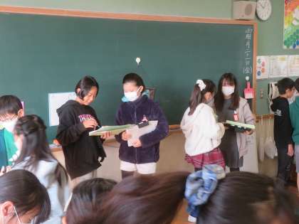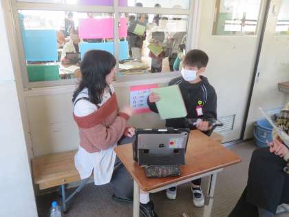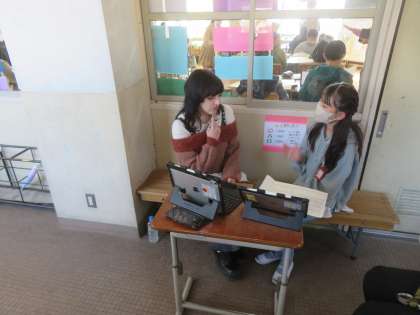 外国語科の学習で、ALTのアリス先生とお話をしました。みんな緊張していましたが、中には3分以上会話が続く人もいたようです。