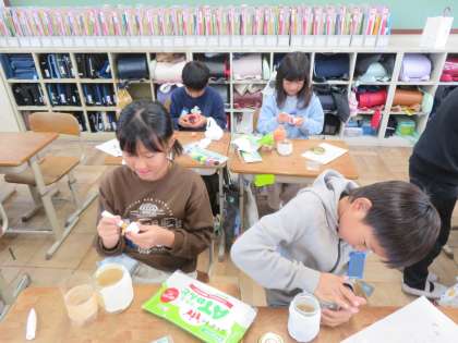イメージに合う、色を作るために絵の具を粘土に混ぜ、こねていきました。
