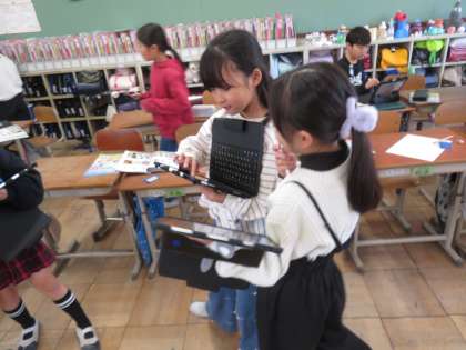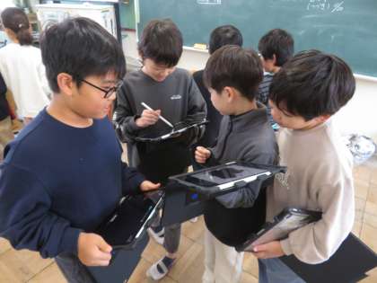 シルエットを見せて、「What's this?」と、友だちに尋ねる活動を行いました。