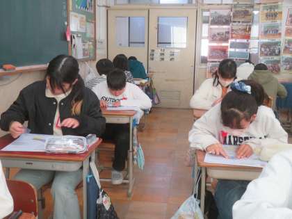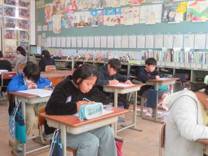 算数科のテストに取り組んでいる様子です。拡大図や縮図をかく問題があるので、子どもたちはコンパスや分度器を駆使して取り組んでいました。
