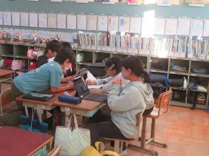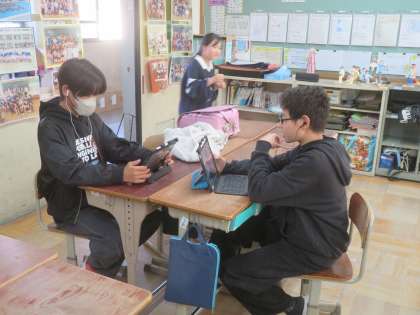 外国語のスピーチの動画を放課後に撮影している様子です。みんな意欲的に取り組んでいて、何度も撮り直していました。