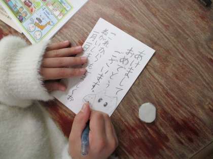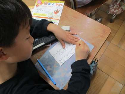 書写の教科書や冊子などをもとに「年がじょう」とは何か、どんな風に書くのかなどを学習しました。