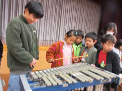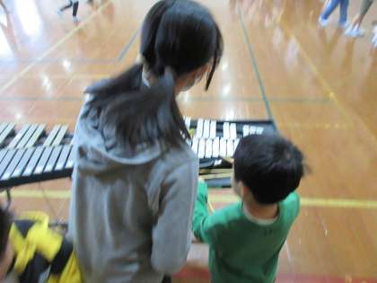 音楽発表会で、様々な楽器があることを知った1年生。6年生が休み時間に楽器を紹介してくれました。優しく教えてもらって、みんなとても嬉しそうです。