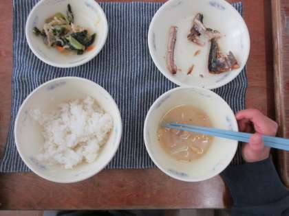 給食には、干物も出ます。煮魚や焼き魚と違って、少し身が固いですが、上手に骨をとって食べられました。「味が濃くて、ご飯に合うね。」と人気の献立でした。