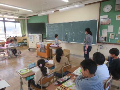 導線を乾電池のどこにつけるかを絵や言葉で説明していました。