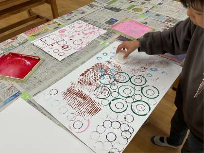 スタンプしたら楽しそうな材料を持って来て、絵の具をつけて紙に写していきました。