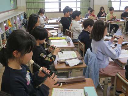 リコーダーで「パフ」を練習しました。同じ音なのに、リズムが異なる場所にみんな苦戦していました。