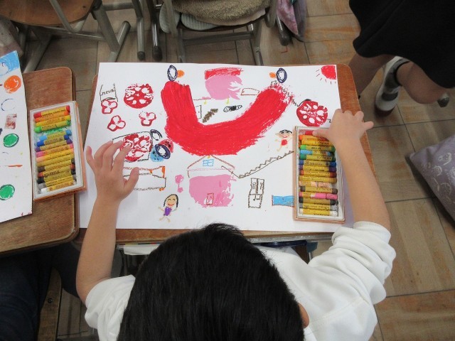 「お家にして、家族のみんなを描くんだ。」「なんだか、野菜畑に見えてきたよ。」と色んな想像を膨らませながら作り、素敵な作品が出来上がりました。