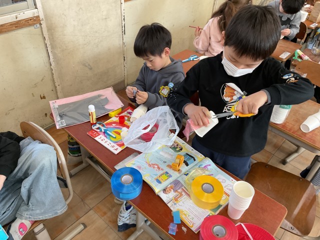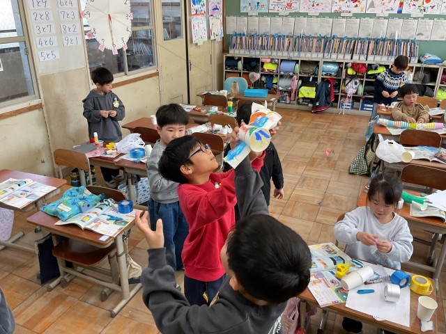 図画工作科で「スルスルビューン」の学習を行いました。どんなものを滑らせたら楽しいのかを考えながら、活動に取り組みました。出来上がった作品を楽しそうに滑らせていまいた。