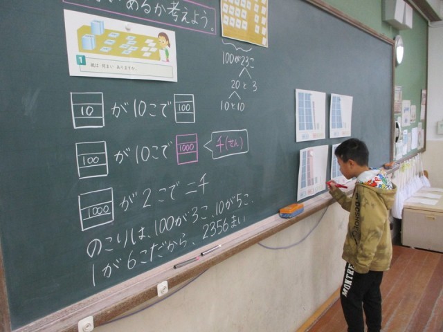 10や100のまとまりがいくつか考えて問題を解きました。