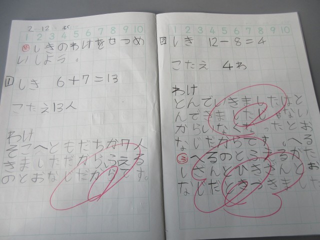 算数科では、足し算か引き算か考えて式にするだけでなく、なぜその計算になるのか、わけを説明する学習をしました。自分の考えをノートに書くのも上手になってきています。