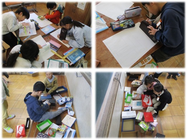 いろいろな形を手に取って、面の数や形についてしらべました。