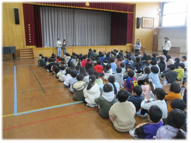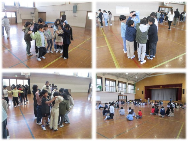 体育館で、5年生のお友だちと一緒に人間知恵の輪に挑戦しました。