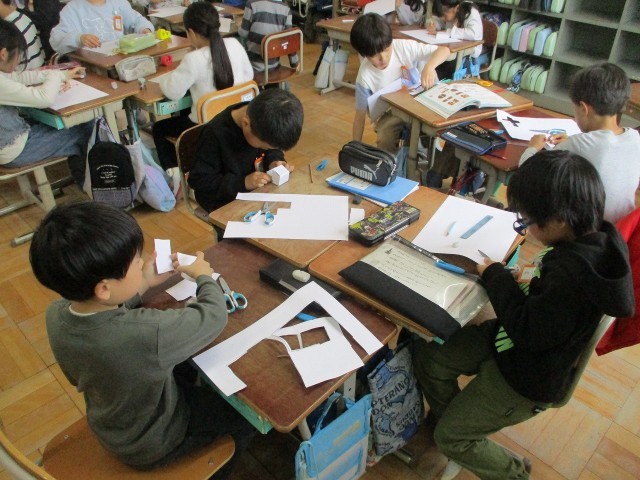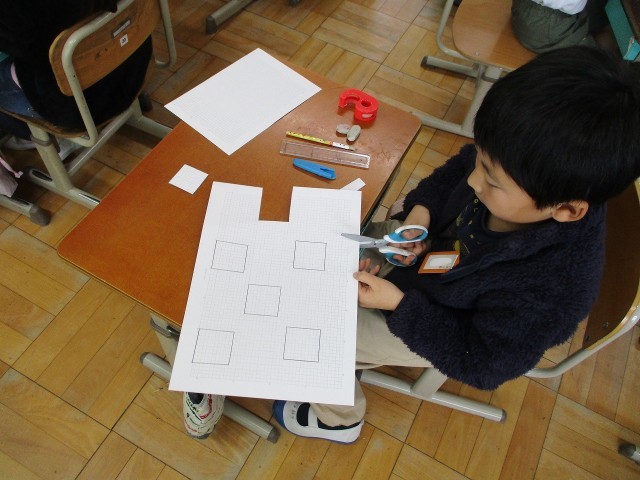 単元の学習のまとめをした後、方眼紙を使って箱作りをしました。