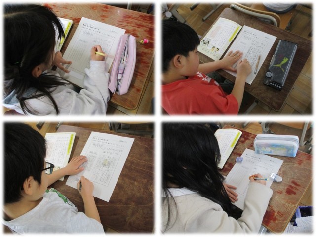 お手本を見ながら、ゆっくり丁寧に文字を書いています。