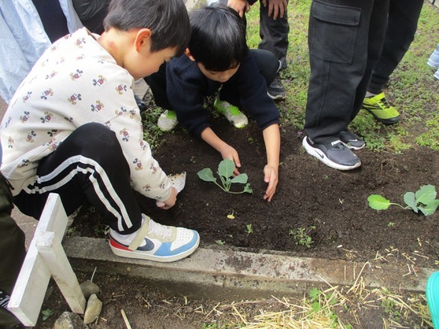来年の理科の学習に向けて、キャベツの苗を植えました。