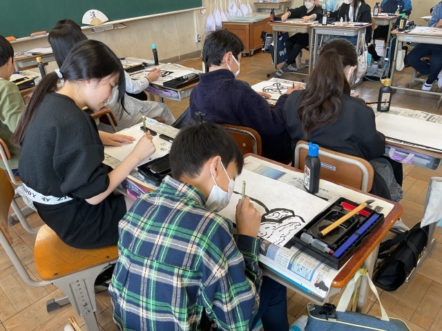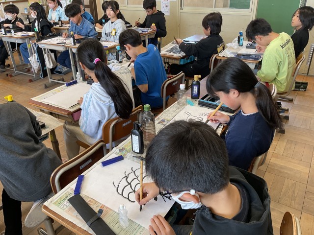 墨を使って思い思いの作品を作っています。水を効果的に使いながら、和紙に絵を描いていました。